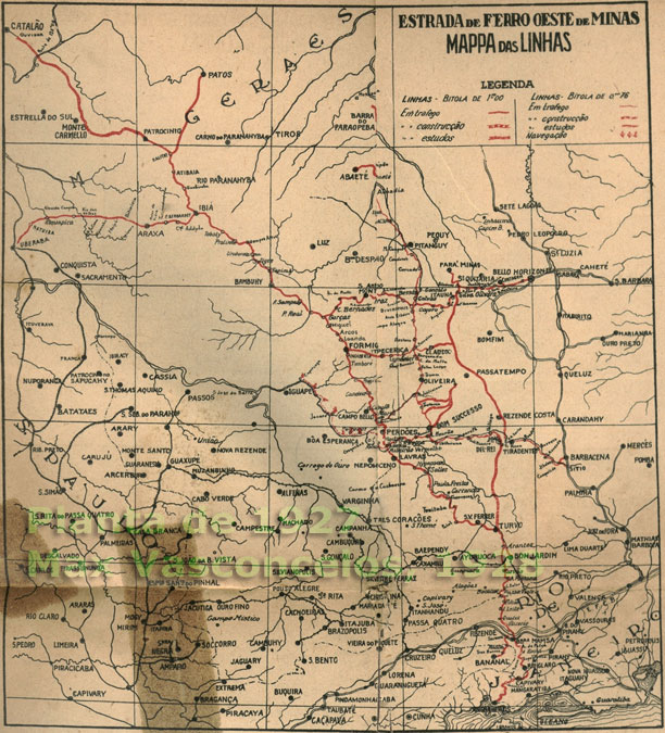 MAPA DAS LINHAS DA ESTRADA DE FERRO OESTE DE MINAS.