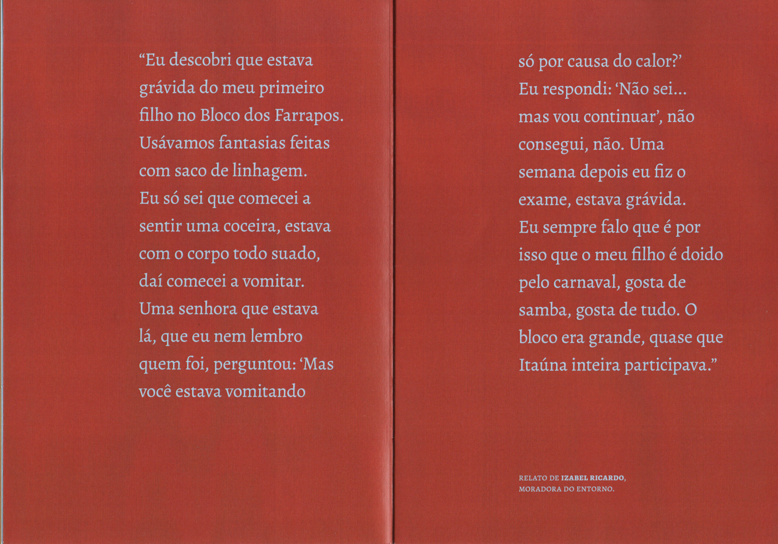 “Eu descobri que estava grávida do meu primeiro filho no Bloco dos Farrapos. Usávamos fantasiasfeitas com saco de linhagem. Eu só sei que comecei a sentiruma coceira, estava com o corpo todo suado, daí comecei a vomitar. Uma senhora que estava lá, que eu nem lembro quem foi, perguntou: “mas você estava vomitando só por causa do calor?” Eu respondi: “não sei… mas vou continuar”, não consegui, não. Uma semana depois eu fiz o exame, estava grávida.Eu sempre falo que é por isso que o meu filho é doido pelocarnaval, gosta de samba, gosta de tudo. O bloco era grande, quase que Itaúna inteira participava.” Izabel Ricardo, moradora do entorno