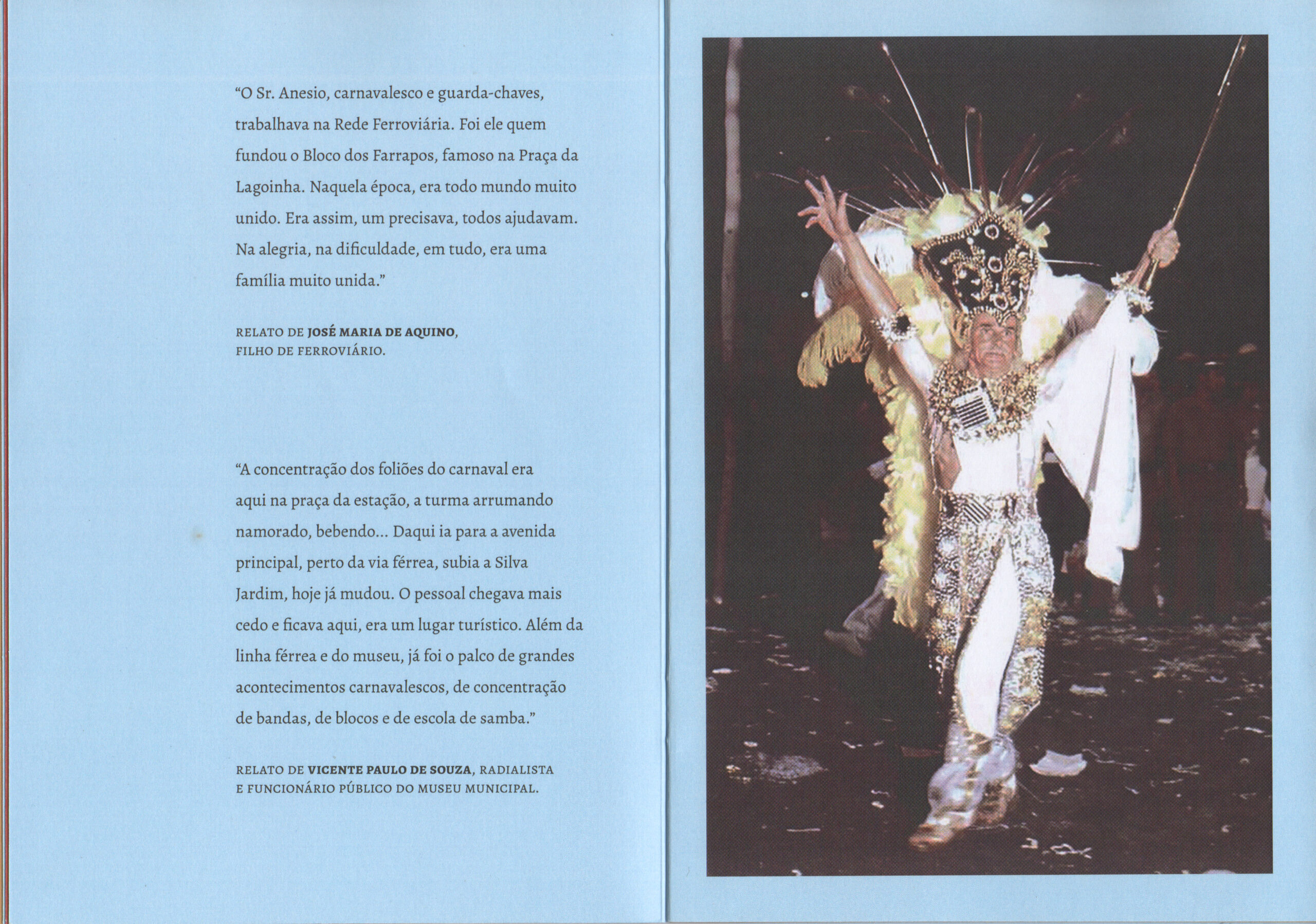 “OSr. Anesio, carnavalesco e guarda-chaves, trabalhava na Rede Ferroviária. Foi ele quem fundou o Bloco dos Farrapos, famoso na Praça da Lagoinha. Naquela época, era todo mundo muito unido.Era assim, um precisava, todos ajudavam. Na alegria, na dificuldade, em tudo, era uma família muito unida.” José Maria de Aquino, filho de ferroviário