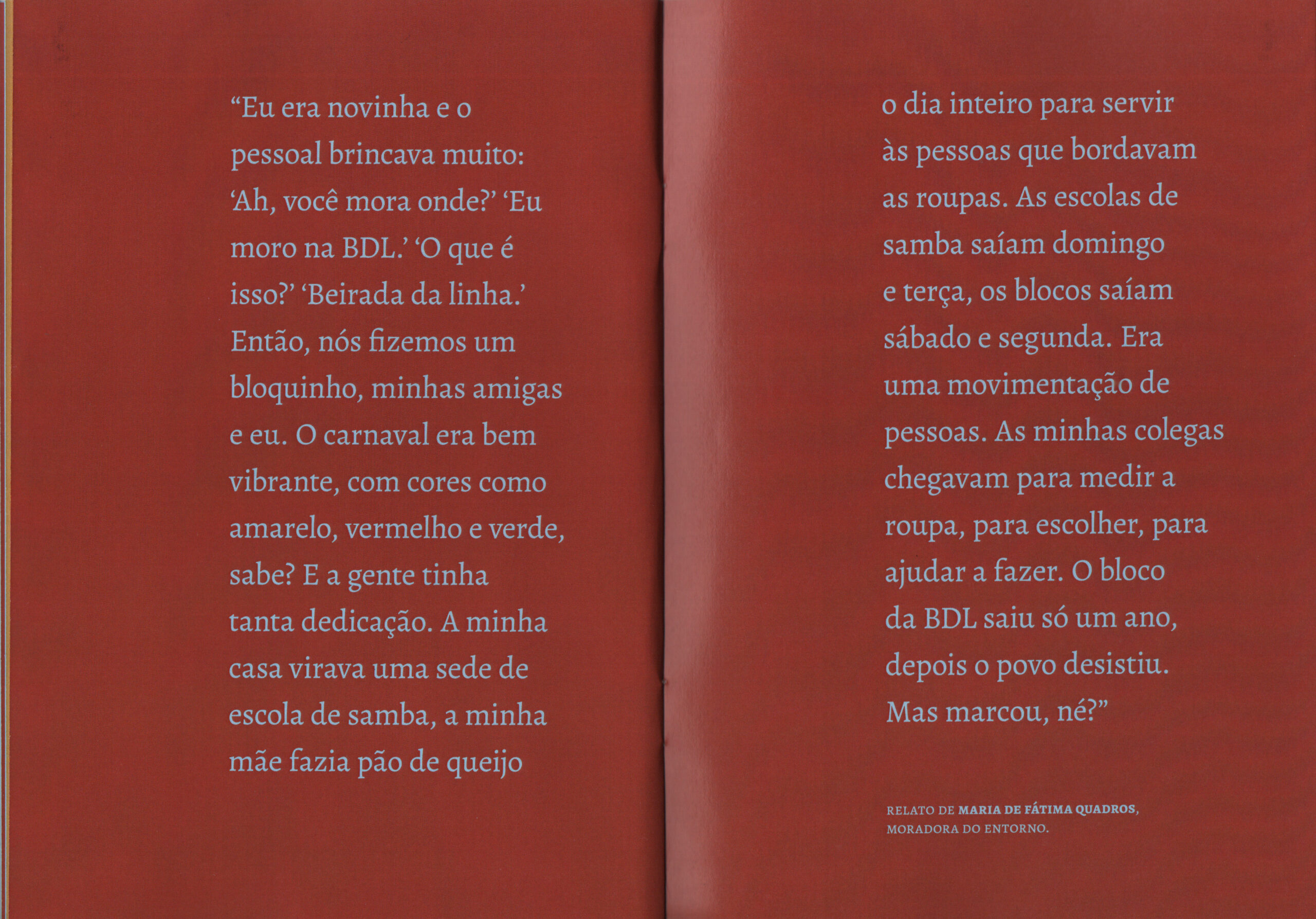 “Eu era novinha e o pessoal brincava muito: “Ah, você mora onde?” “Eu moro na BDL.” “O que é isso?” “Beirada da linha.” Então, nós fizemos um bloquinho, minhas amigas e eu. O carnaval era bem vibrante, com cores como amarelo,vermelho e verde, sabe? E a gente tinha tanta dedicação. A minha casa virava uma sede de escola de samba, a minha mãe fazia pão de queijo o dia inteiro para servir às pessoas que bordavam as roupas. As escolas de samba saiam domingo e terça, os blocos saiam sábado e segunda. Era uma movimentação de pessoas. As minhas colegas chegavam para medir a roupa, para escolher, para ajudar a fazer. O bloco da BDL saiu só um ano, depois o povo desistiu. Mas marcou, né?” Maria de Fátima Quadros, moradora do entorno