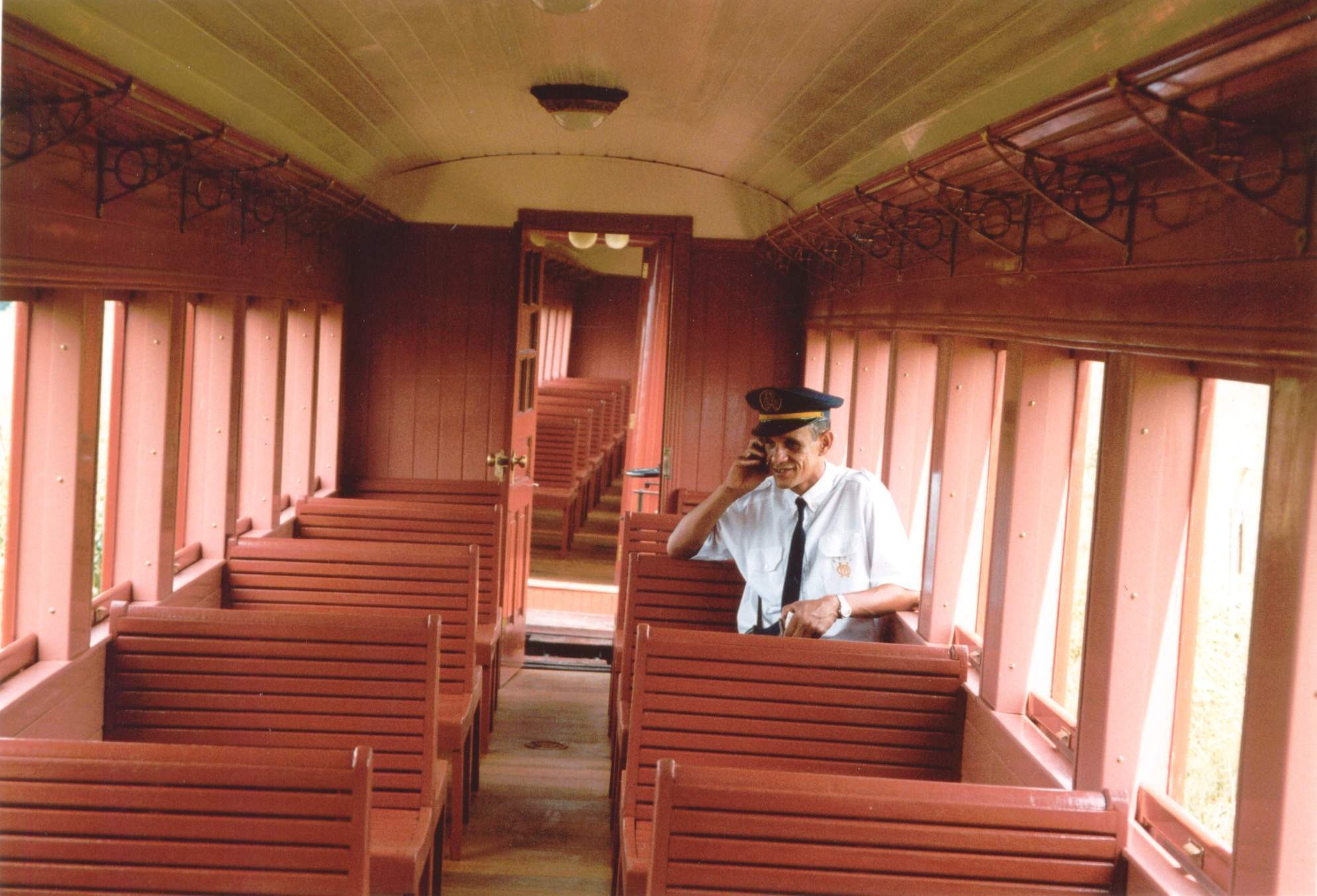 Chefe de Trem Ilair Santana, no vagão de passageiros (2ª classe). Autoria desconhecida, século 20. Arquivo pessoal de Gustavo Zenquini (São João Del-Rey).